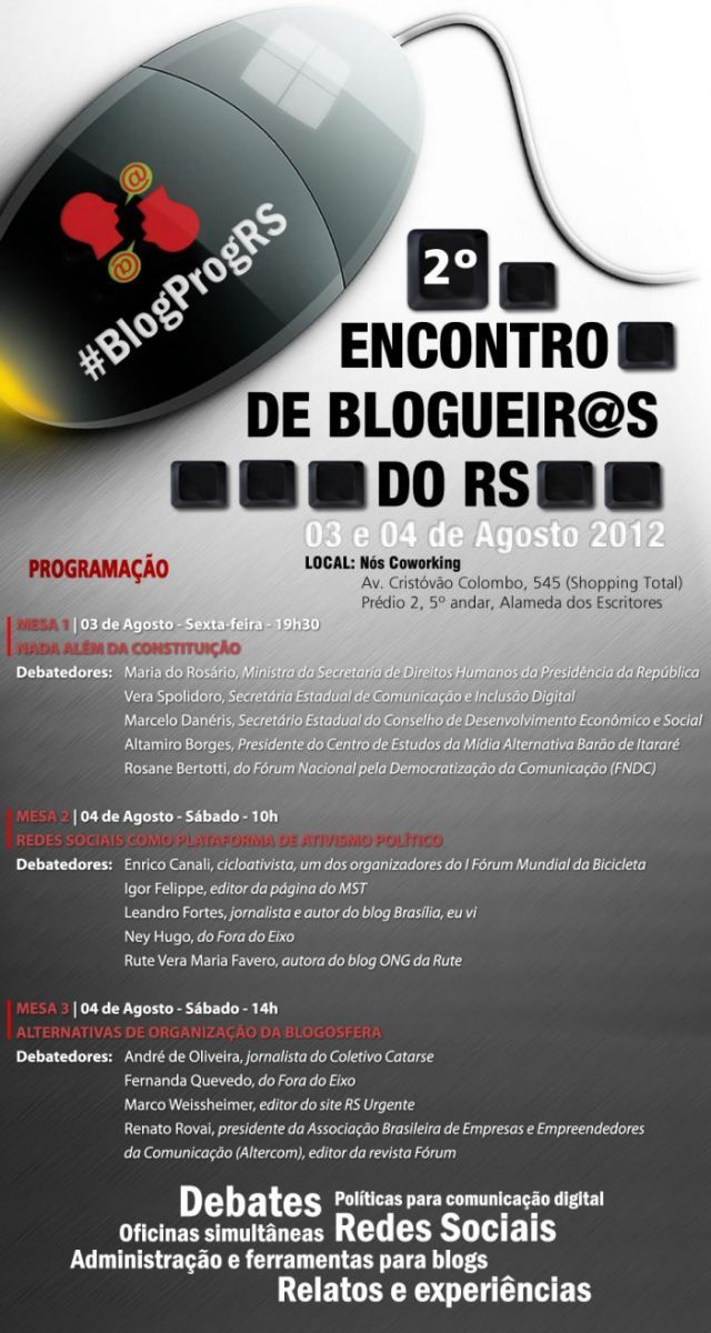 O 2º Encontro de Blogueiros Progressistas do Rio Grande do Sul acontece nos próximos dias 3 e 4 de agosto (sexta e sábado) em Porto Alegre, e debaterá, entre outros temas, as redes sociais como plataforma de ativismo político e as alternativas de organização da globosfera para a luta pela democratização da comunicação e do país.