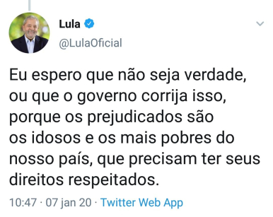 O ex-presidente Lula utilizou o twitter para criticar os atrasos na concessão de benefícios da Previdência. Segundo ele, é a volta da cruel fila do INSS que seu governo tinha acabado.