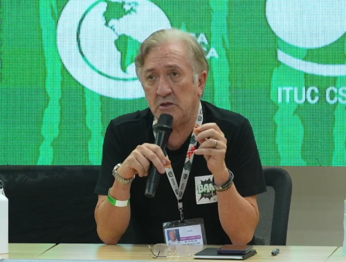 Mariano Ángel, da UGT da Espanha, durante a apresentação, destacou a importância das alianças globais e da redução das desigualdades para enfrentar a crise climática. Segundo ele, o avanço depende de compromissos concretos entre Norte e Sul.