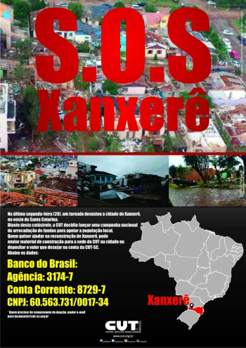 Quem quiser ajudar na reconstrução de Xanxerê, pode enviar material de construção para a sede da CUT na cidade ou depositar o valor que desejar na conta da CUT-SC. Abaixo os dados:
