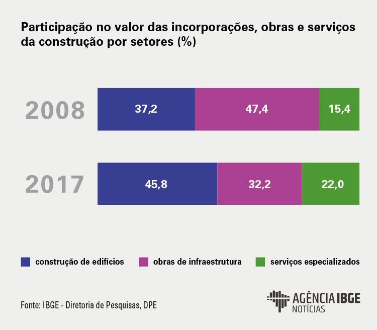 Boa parte dessa retração, explicou Fernanda, se refletiu no segmento de infraestrutura, que perdeu participação no valor das incorporações, obras e/ou serviços ao longo dos últimos anos. Por outro lado, a construção de edifícios ganhou representatividade. De 2008 a 2017, a participação do segmento de infraestrutura caiu de 47,4% para 32,2%, enquanto a da construção de edifícios cresceu de 37,2% para 45,8%.