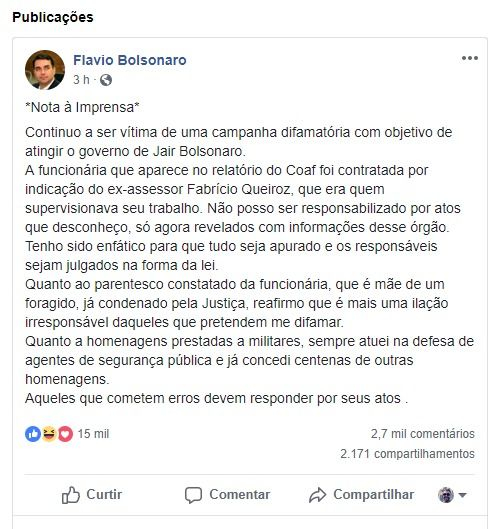 “Não posso ser responsabilizado por atos que desconheço, só agora revelados com informações desse órgão. Tenho sido enfático para que tudo seja apurado e os responsáveis sejam julgados na forma da lei”, diz Flávio na nota que joga a culpa em Queiroz.