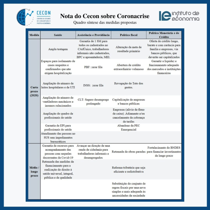 Diversos pesquisadores do campo da heterodoxia econômica também têm se manifestado aqui no Brasil com sugestões de propostas de como agir frente à crise muito mais sensatas para o momento que as propostas de Paulo Guedes e seu time. É o caso de pesquisadores do Cecon do Instituto de Economia da Unicamp, que apresentam as propostas sintetizadas no quadro abaixo , de professores do Instituto de Economia da UFRJ e de professores da Faculdade de Ciências Econômicas da UFRGS. Até mesmo grandes nomes da ortodoxia econômica brasileira e do mercado têm dado o braço a torcer e passam a pedir auxílio do Estado nesse momento.