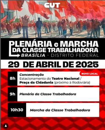 Nesta terça-feira, 29/04, a CUT e demais centrais sindicais realizam em Brasília a Plenária e Marcha da Classe Trabalhadora, e entregarão ao Presidente Lula e também aos presidentes da Câmara, do Senado, do STF e do TST, a pauta de reivindicações dos trabalhadores e das trabalhadoras.