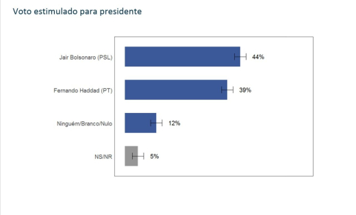 No cenário estimulado da pesquisa, Bolsonaro aparece com 44% das intenções de votos - 53% dos votos válidos, que exclui brancos/nulos e indecisos -; Haddad tem 39% - 47% dos válidos.