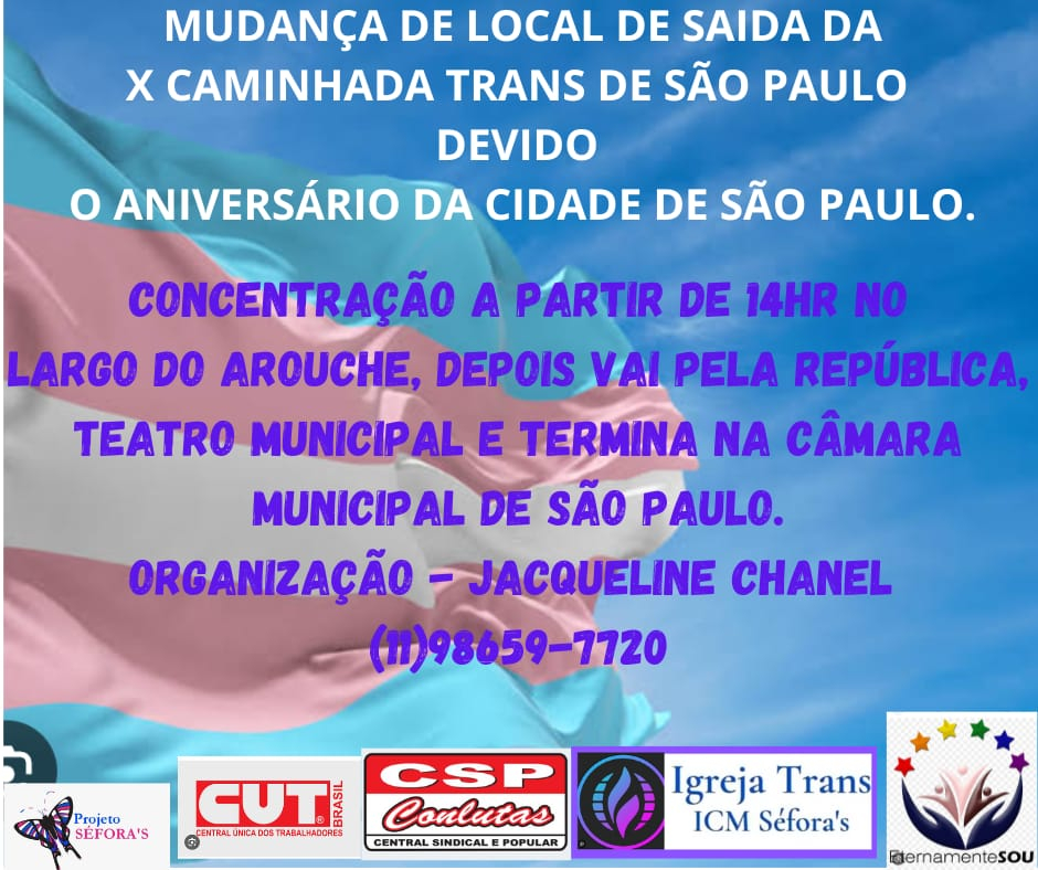 A 10ª Caminhada Trans de São Paulo é organizada por coletivos trans, movimentos LGBTs, sentrais sindicais, entre elas, a CUT. O evento integra o calendário de mobilizações por visibilidade, respeito e garantia de direitos para a população trans e travesti. Para mais informações, acesse o instagram do evento.