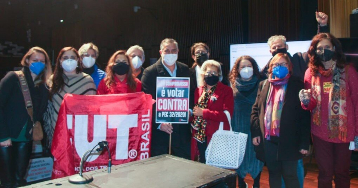Com apoio do parlamento gaúcho e transmissão nas redes sociais, o seminário estadual “Os impactos da PEC 32 nos serviços públicos municipais, estaduais e federal” foi coordenado pelo deputado federal Paulo Pimenta (PT-RS), que integra a Comissão Especial da Câmara que discute a PEC 32. Houve também a participação do deputado federal Elvino Bohn Gass (PT-RS) e vários deputados estaduais do PT e PSol.