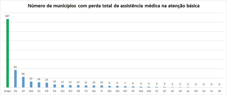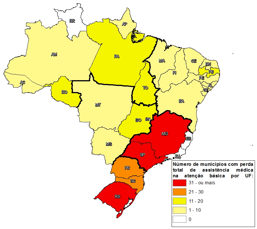A tabela e o mapa Percentual de municípios com perda total de assistência médicareferem-se àqueles municípios que só contam com a presença dos médicos cubanos.