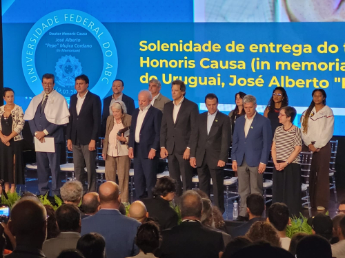 Nesta quarta-feira (18), outra homenagem foi feita a José Mujica com a concessão do título de Doutor Honoris Causa pela Universidade Federal de Minas Gerais (UFMG), em cerimônia realizada no auditório da reitoria e marcada pela entrega da honraria à sua companheira, Lucía Topolansky. A decisão, aprovada pelo Conselho Universitário em abril do ano passado, reconhece a trajetória do ex-presidente uruguaio como referência na defesa da educação pública, da integração latino-americana e da justiça social, valores que marcaram sua atuação política e seu legado no continente.